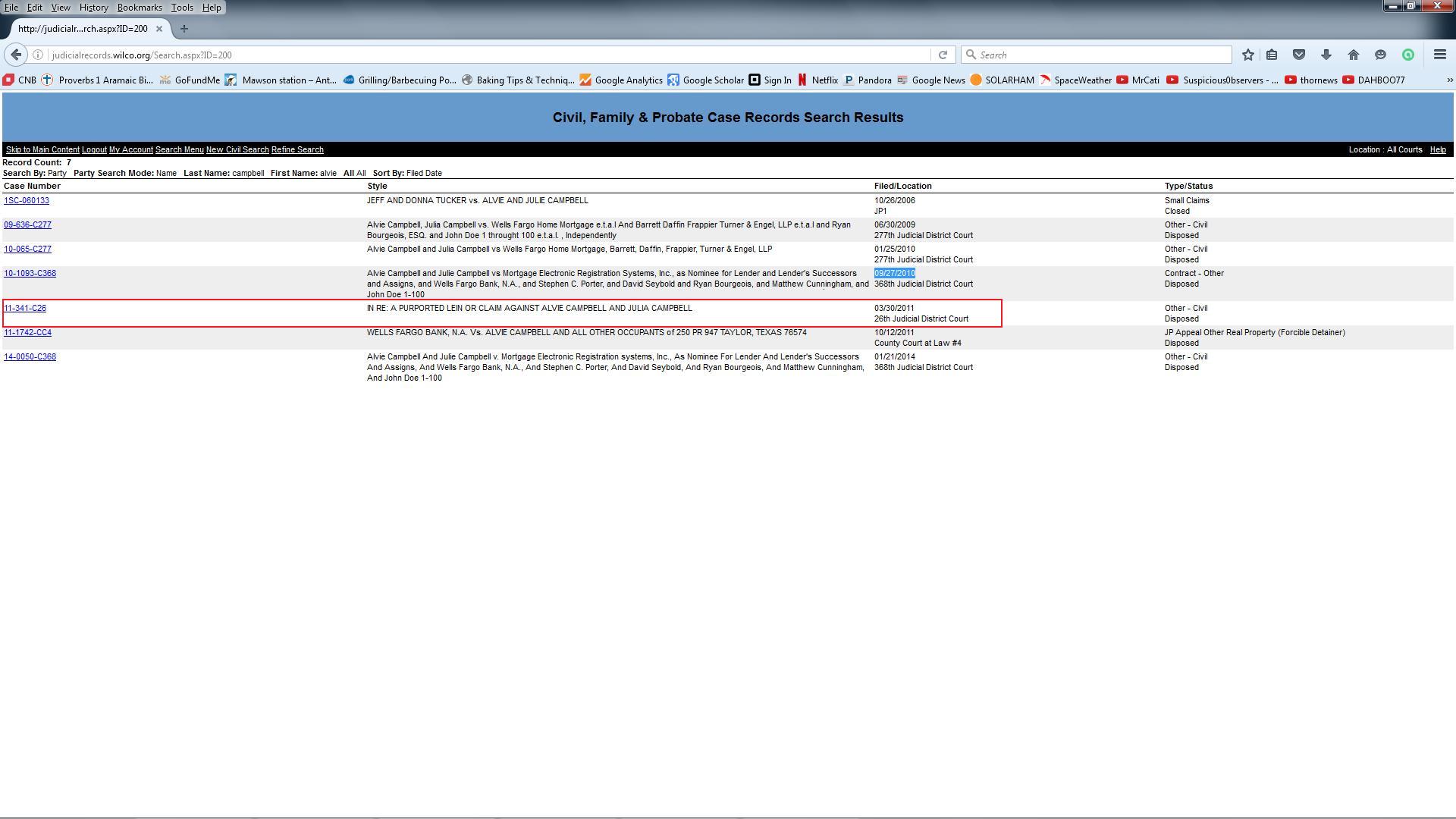 The image above reflects a basic search for "grantor" named Alvie Campbell. This is the report. In 2008, MERS allegedly transferred the note and deed of trust to Wells Fargo, also in 2008 John Latham of Barrett Daffin Frappier Turner & Engel became the "trustee". Allegedly on September 7, 2010, Alleged Trustee sold the Campbell's real property in a "foreclosure" auction. Wells Fargo alleged it purchased the real property in an auction. The Campbell's file suit September 27, 2010. September 27, 2010, the Campbell's also filed a Liz Pendens in Williamson County public records which still stands as constructive notice.