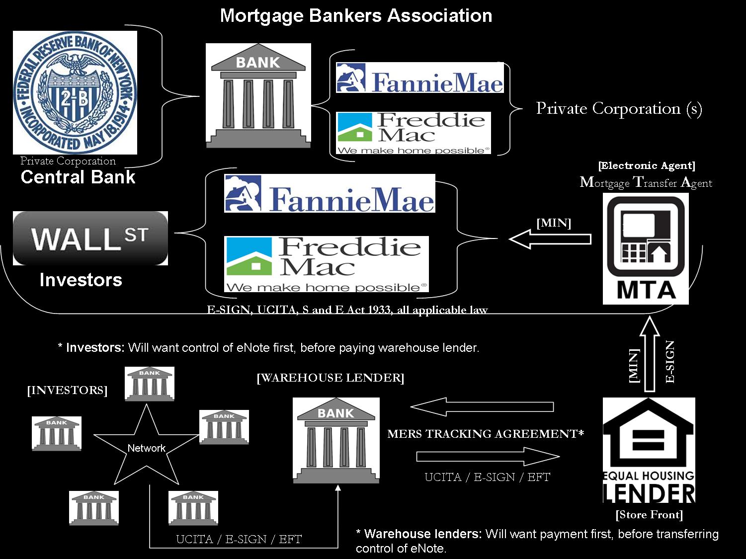 Yep, Mr. investor, they say you will be the "ultimate" owner of the promissory note. The note is a promise to pay, but since MERS has the deed of trust, they get the land. Comprende? You hold a piece of personal property, excluding the real property. That is the carrot for you. But, your servicer is out flipping the real property for a profit and provides you with what you deserve. You hold the note, the book entry sysstem holds the mortgage, so they say. Want to blame someone? Blame it on the lawmakers. They allowed MERS to use you as an "unknown" party to their crimes. Has tax evasion ever came to your mind? You may even want to scrutinize the note because of electronic laws. Once converted to paper, it is paper, not electronic. You can't rescan it. And another thing for you to think about? Can you support your argument of a converted electronic contract; and can that electronic contract meet the requirements of Article 3, negotiable instruments? According to what they say, don't you realize you own the note? So, where is the chain of the "unknowns" whom sold it to you? Securitization is a step process. Each step, laws were to control such actions in the step, including local law of jurisdiction. They missed many laws in the steps to get you your electronic note. But then again, who know whom the investor is? It is easy to make things up. Isn't that what the justice depaartment found out? Where are the investors? Imagine that, an imaginary stock market?